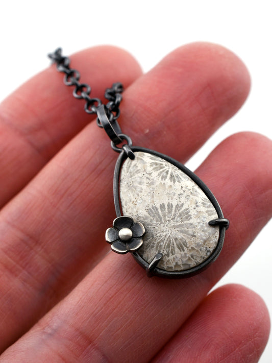 Nature's artistry is at work with this lovely fossilized coral. Flower patterns bloom within the stone, inspiring the cluster of silver flowers that seem to grow out from the coral.