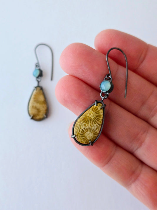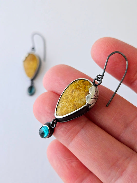 Fossilized coral and Garnet earrings-SS/14K