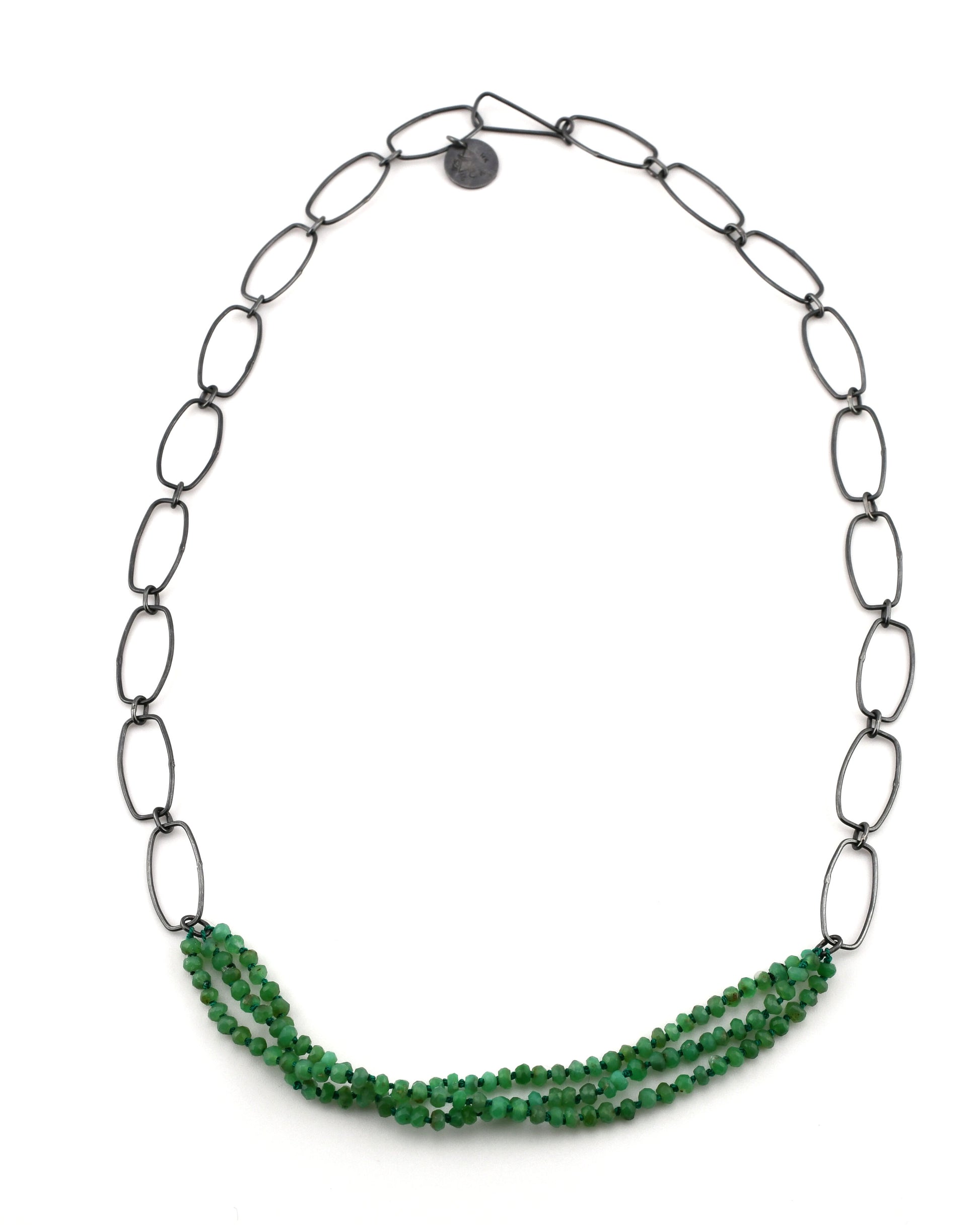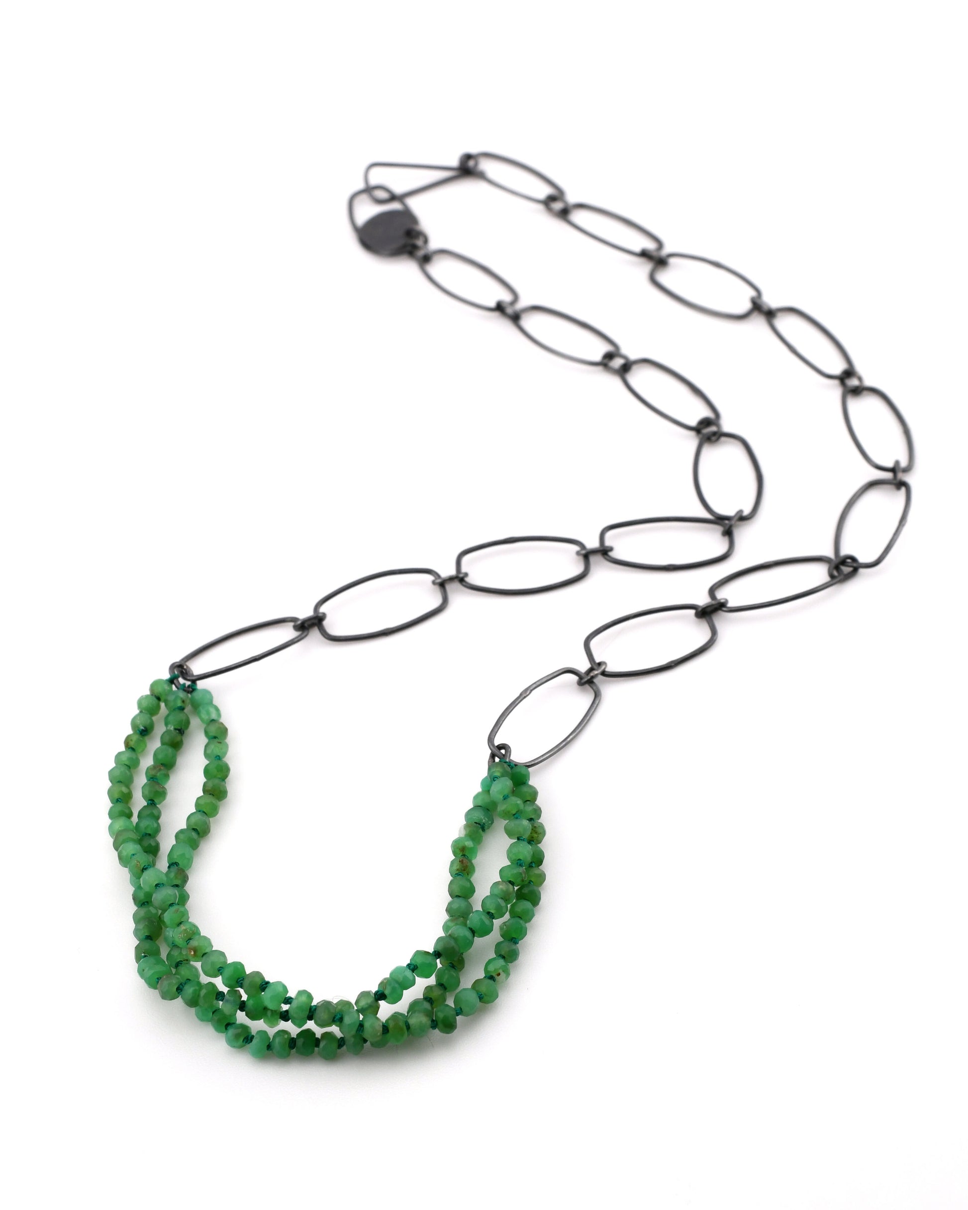 Deep apple green faceted Chrysoprase rondelle beads are threaded on dark green silk and knotted by hand into three strands. The beads are paired with handmade blacked silver chain for a unique, modern look.