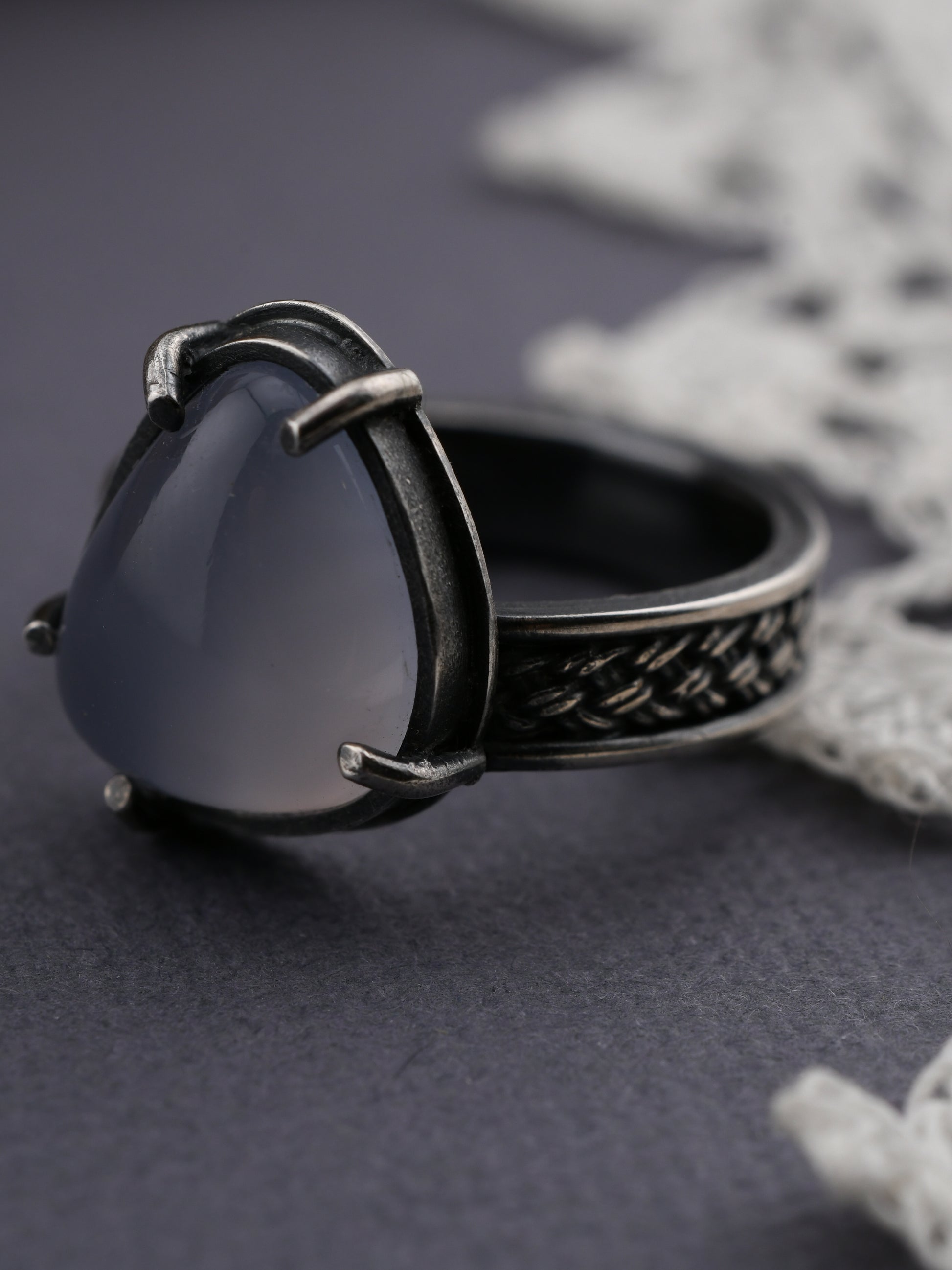 Strands of silver are braided to form a beautiful pattern and texture around the shank of this ring. Held within a channel of silver, the braid creates a sinuous weaving of light and dark within its rigid confines. A luminous lavender chalcedony cut into a rounded freeform shape is held by silver prongs. The silver has been blackened and lightly polished to bring out the intricacy of the details. Every part of this ring is handmade with intention and care.