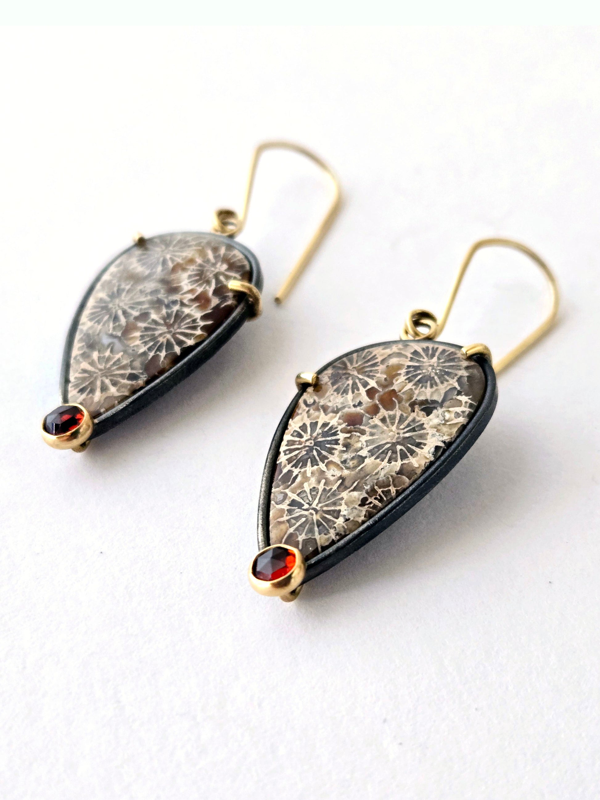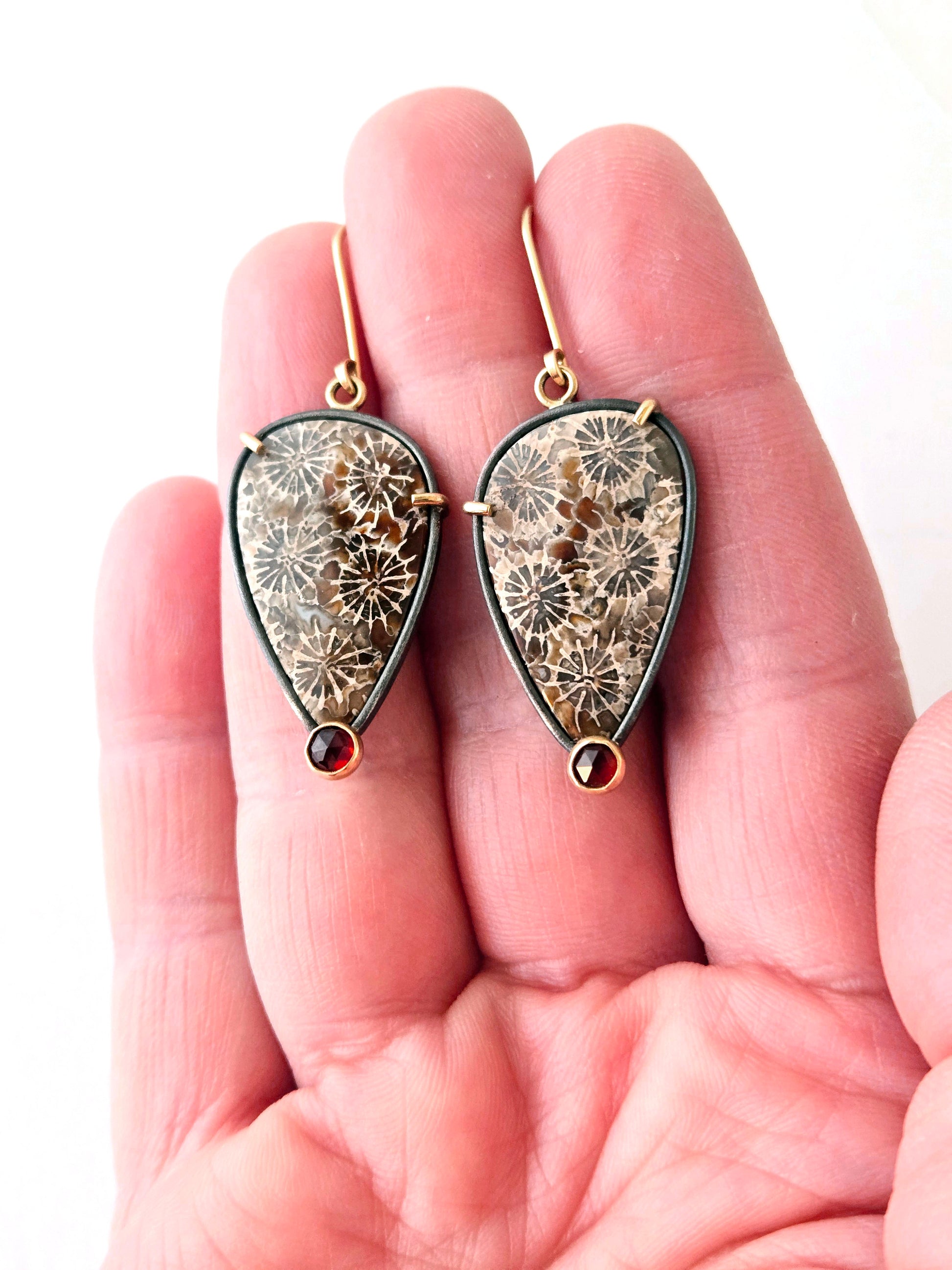 Freeform fossilized corals show a distinct starburst pattern in shades of red and midnight blue, outlined in creamy white. The closer you look at the stones, the more they pull you into their amazing shifts of color and pattern. The stones are framed in blackened silver with 14k gold prongs. 4mm rose cut garnets cupped in 14k gold are set at the points of the stones, resting atop the frames. The ear wires and connectors are 14k gold, contrasting beautifully with the oxidized silver.