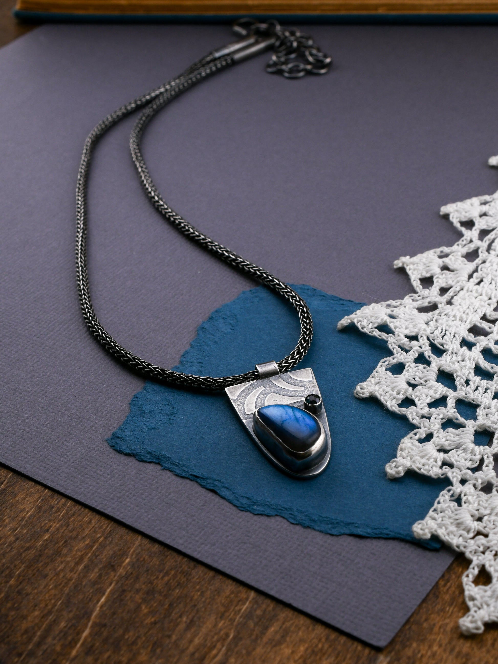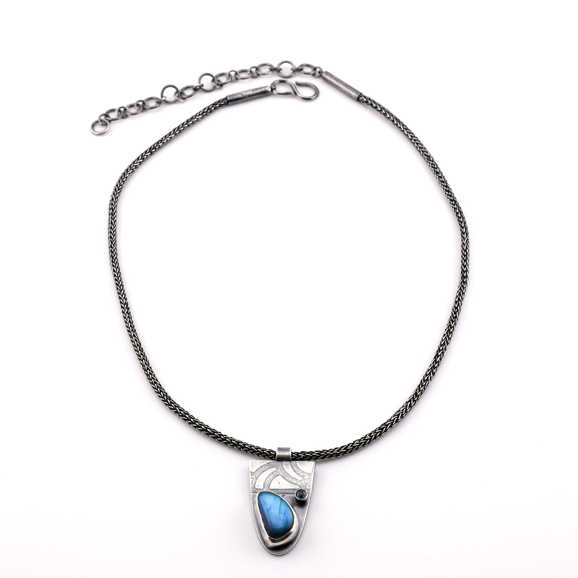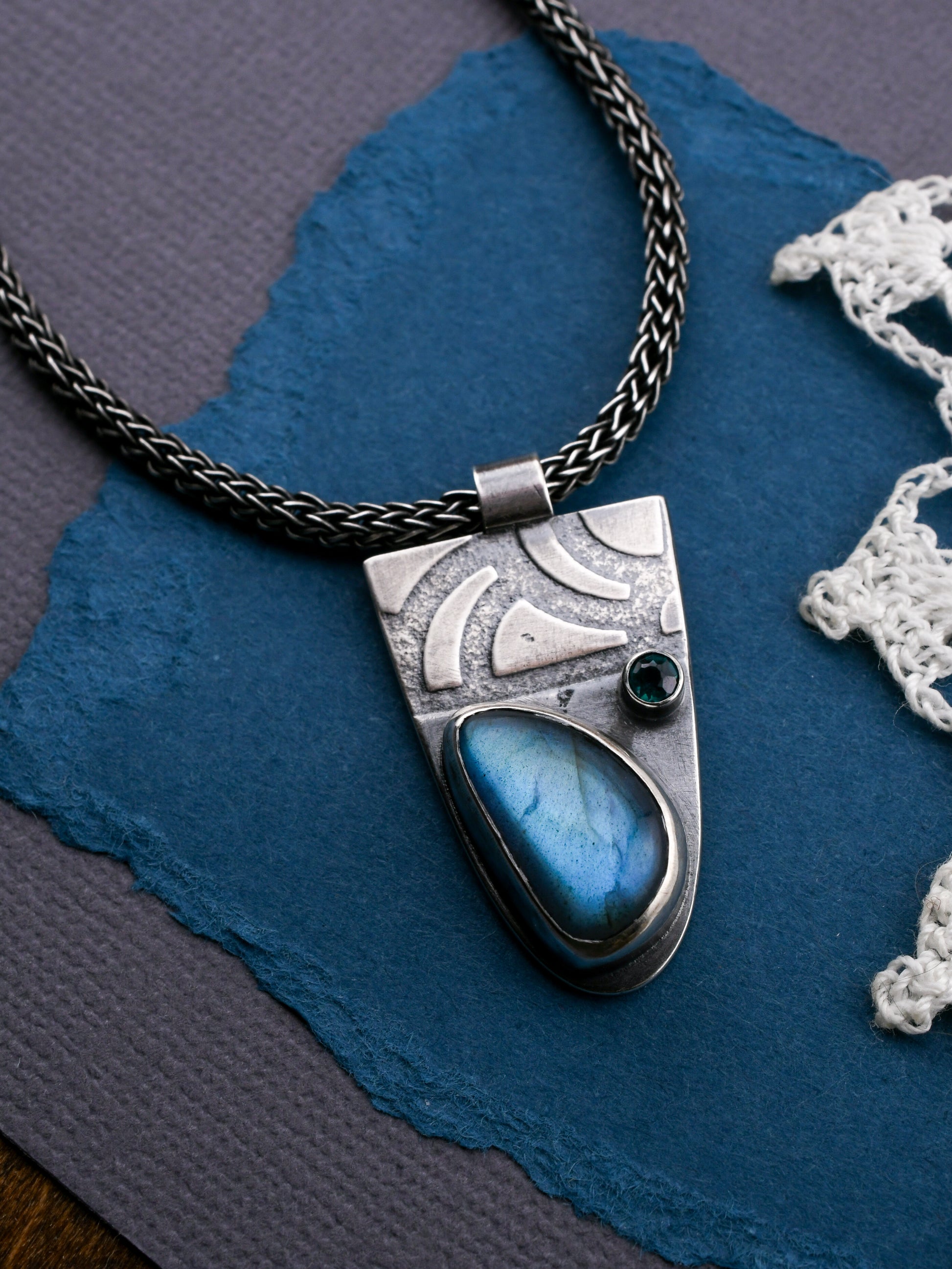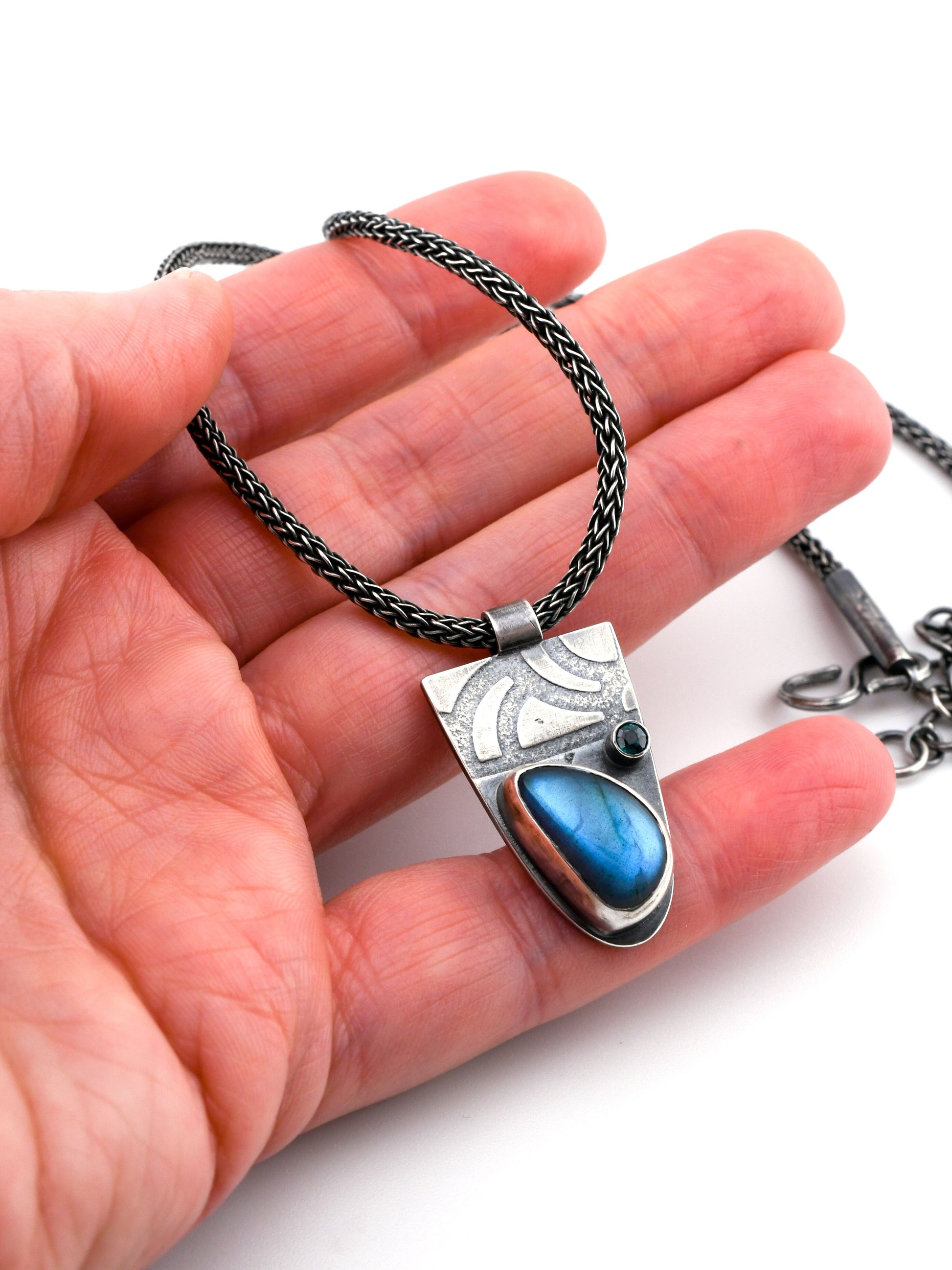 Flashing blue Labradorite captures the eye first. A pendant made of a tongue of hand-poured silver is imprinted with curving designs and granular texture. A high dome free-form Labradorite with vivid blue flash sits below the design and is accented with a small faceted teal blue topaz. A hand-knitted silver chain holds this pendant close, adding more pattern and texture to the piece. The entire necklace is oxidized and given a brushed finish to bring out the design and details.