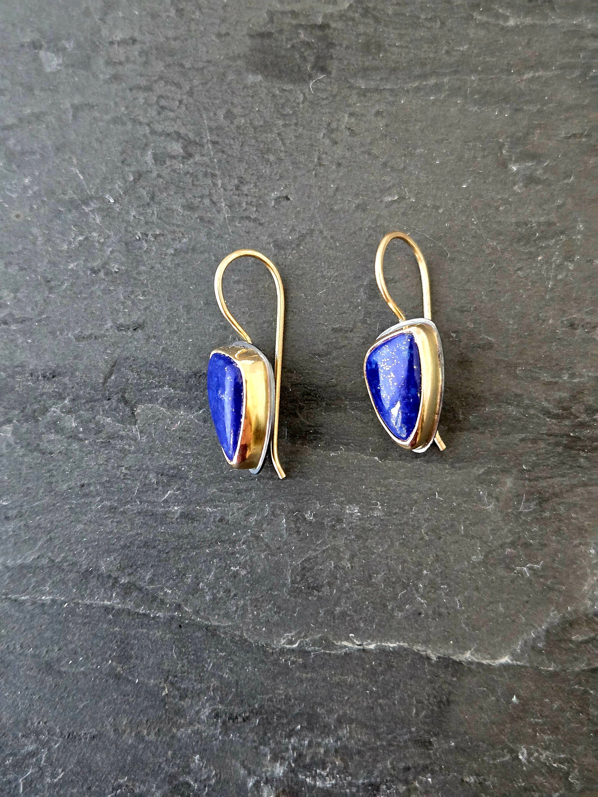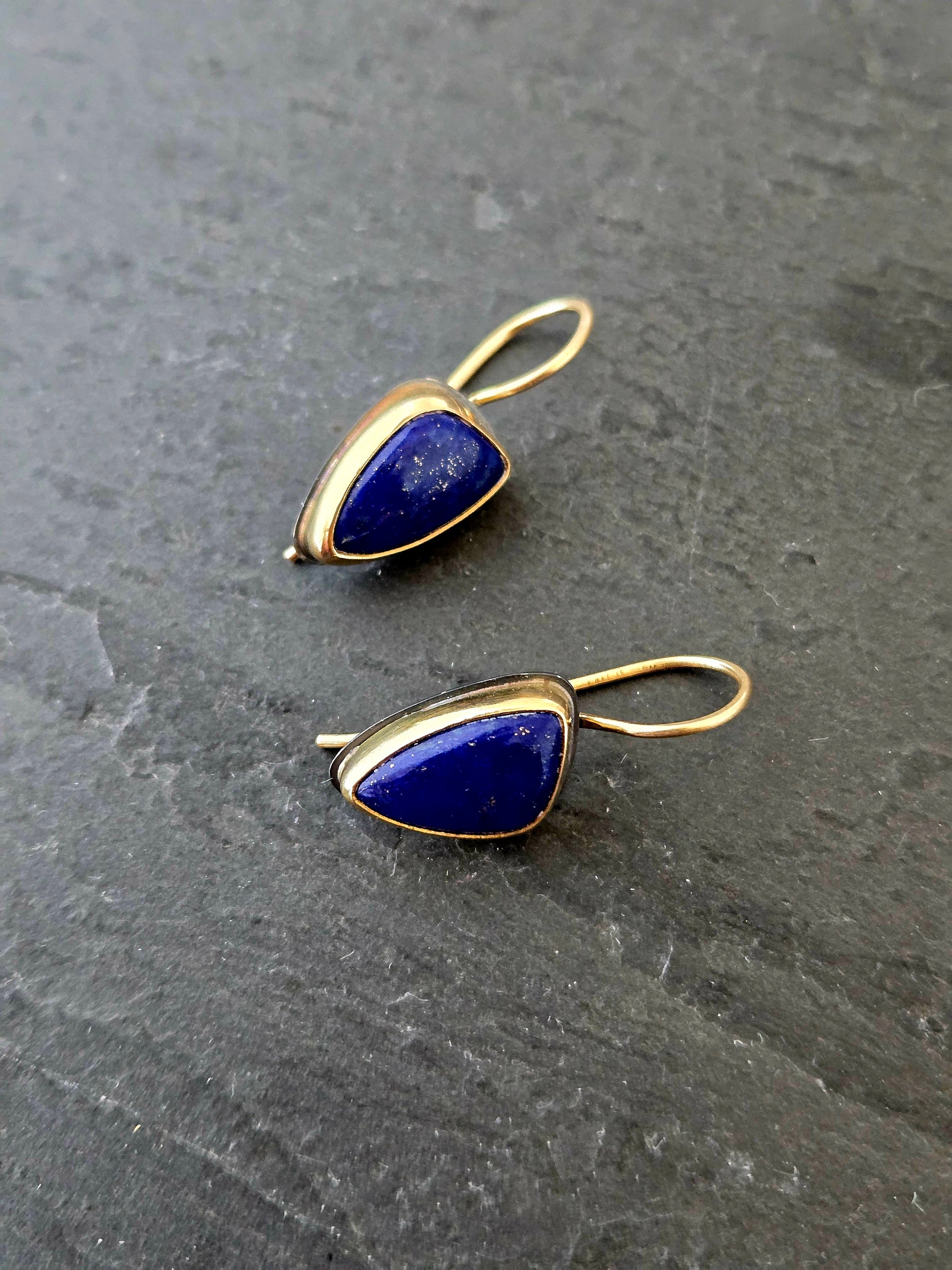 Deep blue Lapis lazuli cabochons are set in 14k yellow gold to create a richly elegant pair of drop earrings. The stones are a saturated royal blue, with sparkling pyrite inclusions, and cut into a dramatic shield shape. Yellow gold brings out the vivid blue color in the stones, while blackened silver backplates provide the perfect contrast. The gold ear wires are curved just above the stones, so that they hug close to the bottom of the earlobe.