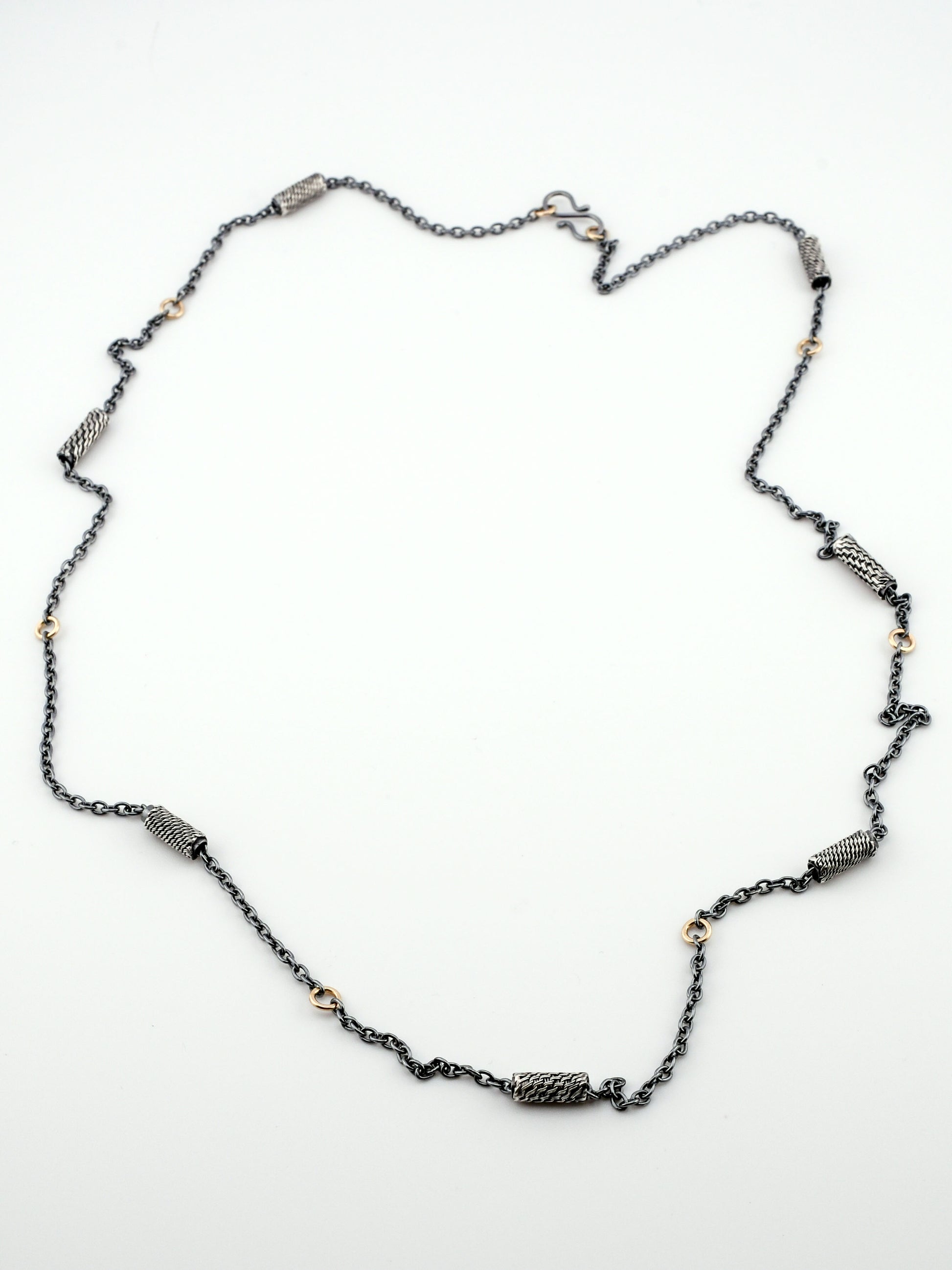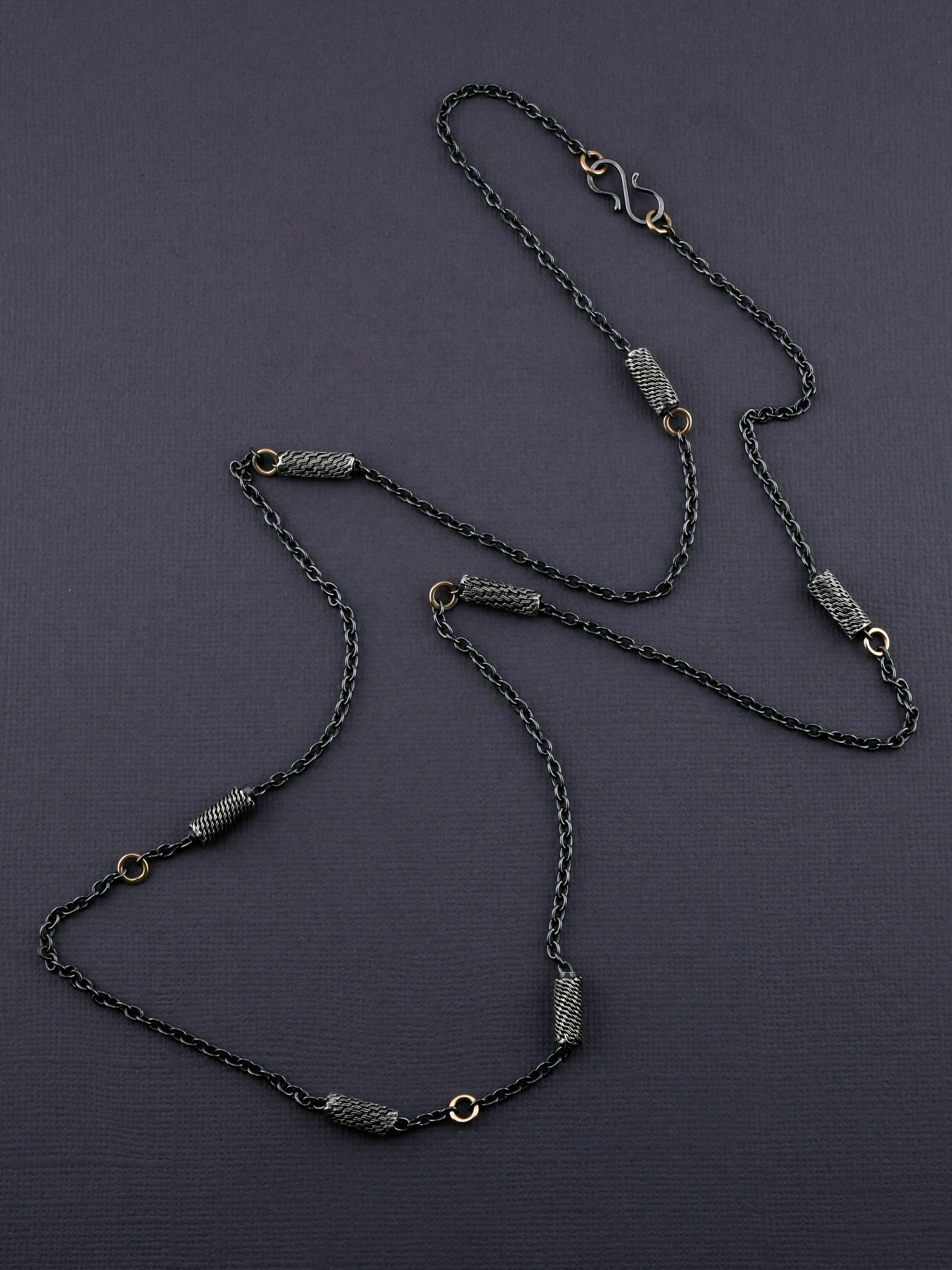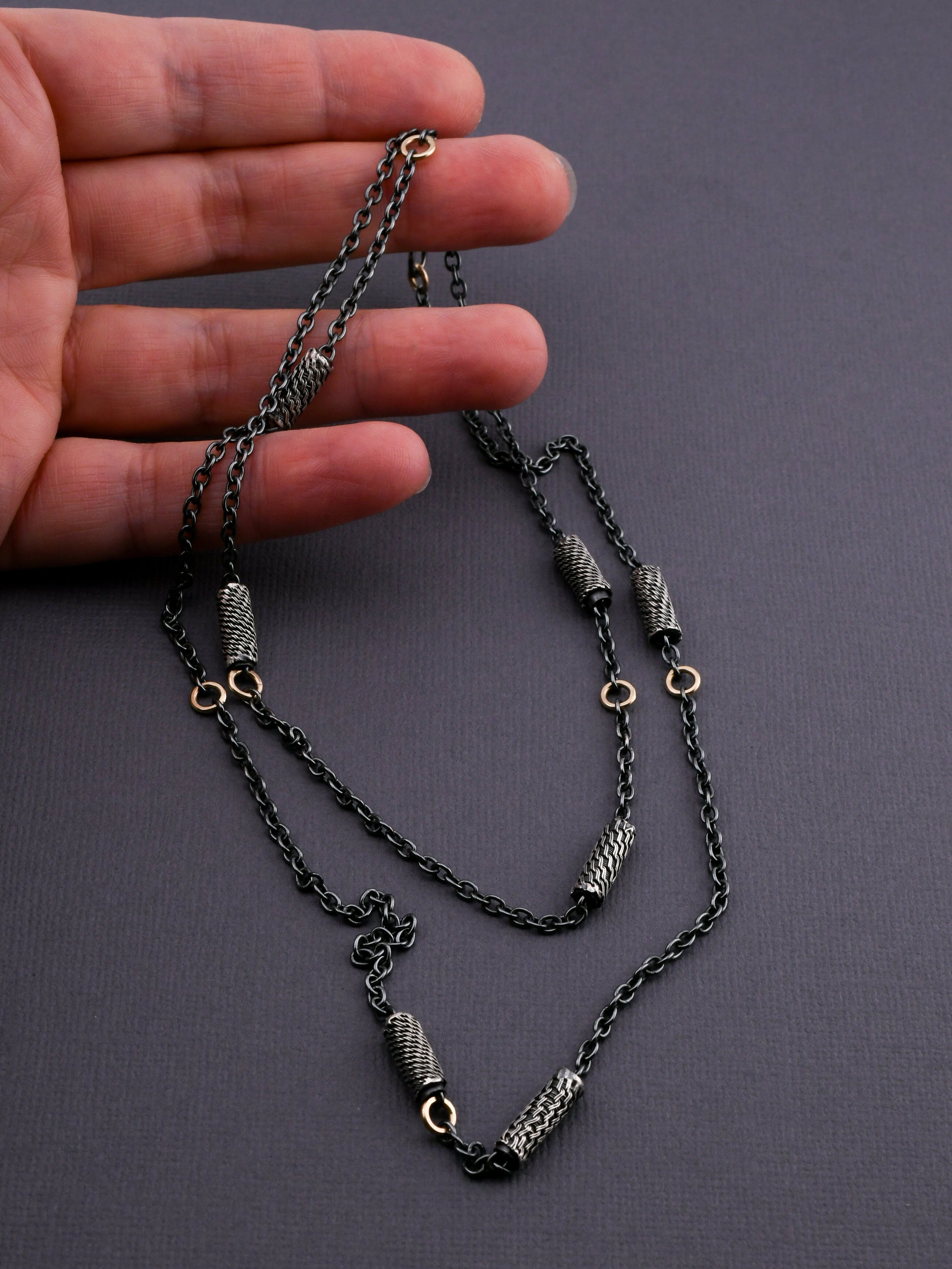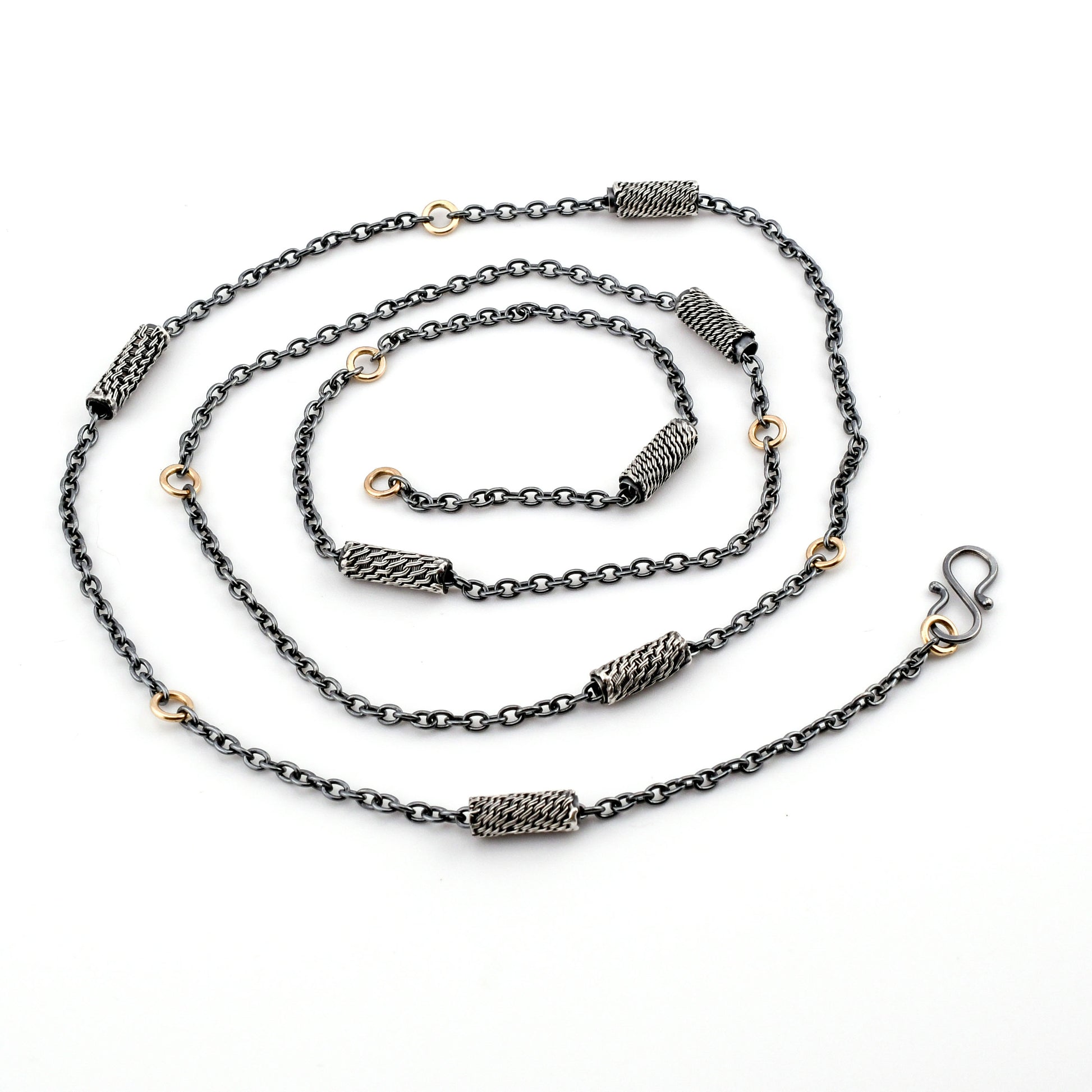 Long and perfect for layering, this chain necklaces features 7 woven silver beads threaded on segments of chain, all connected with heavy 14k gold links. Each bead is formed from fine silver wire that has been meticulously braided and twined in a tight spiraling weave, and then sheathed over sterling silver tubing to give strength and structure to the design. Each bead slides freely along its segment of chain, moving along the chain as it moves with your body. The necklace is long enough to double into a choker, wear layered with other chains or by itself, or adjust to a shorter length or wear as a lariat. The silver has been oxidized and then lightly brushed to highlight and show contrast in the pattern. The blackened patina contrasts beautifully with the yellow gold accents.