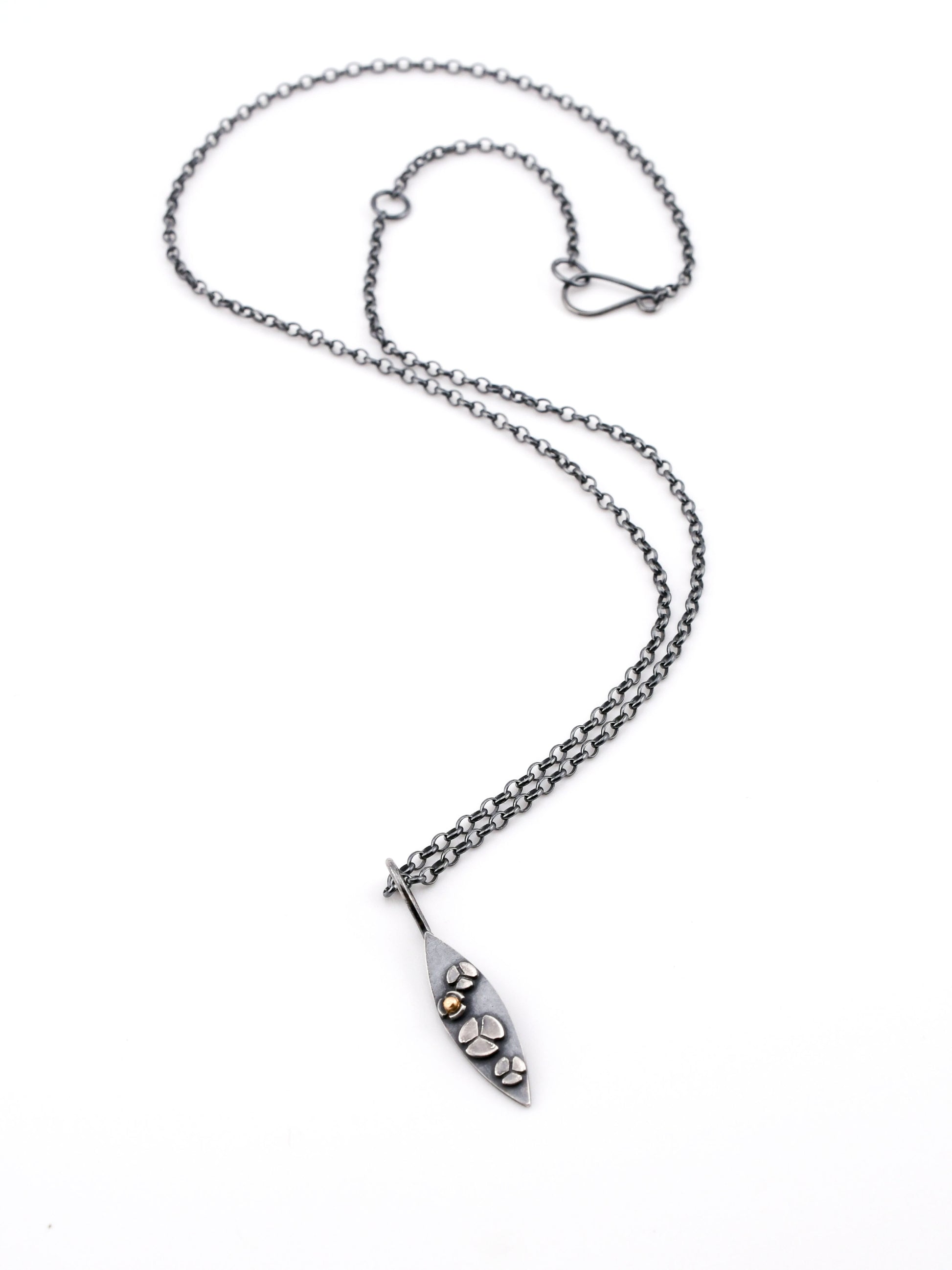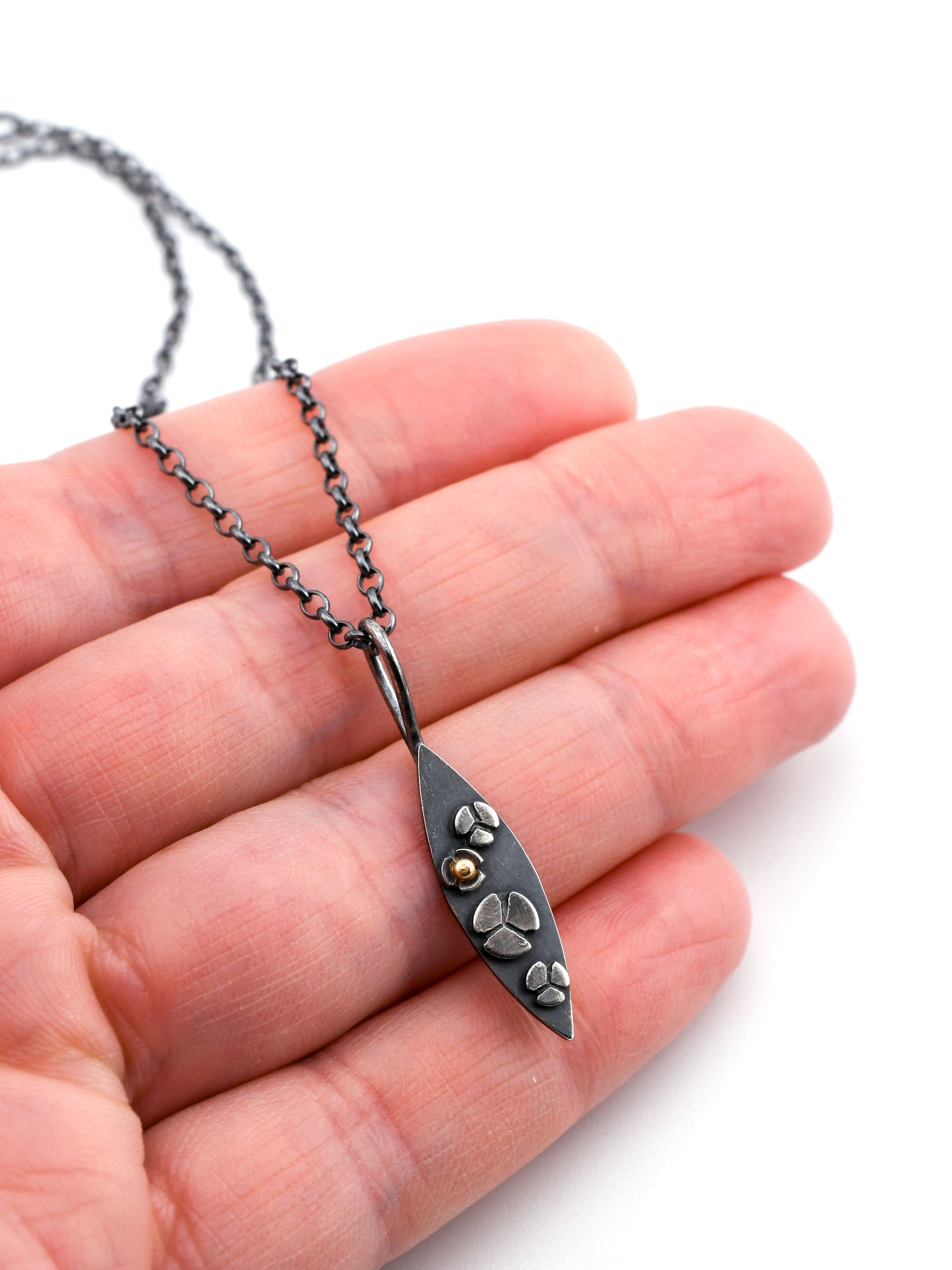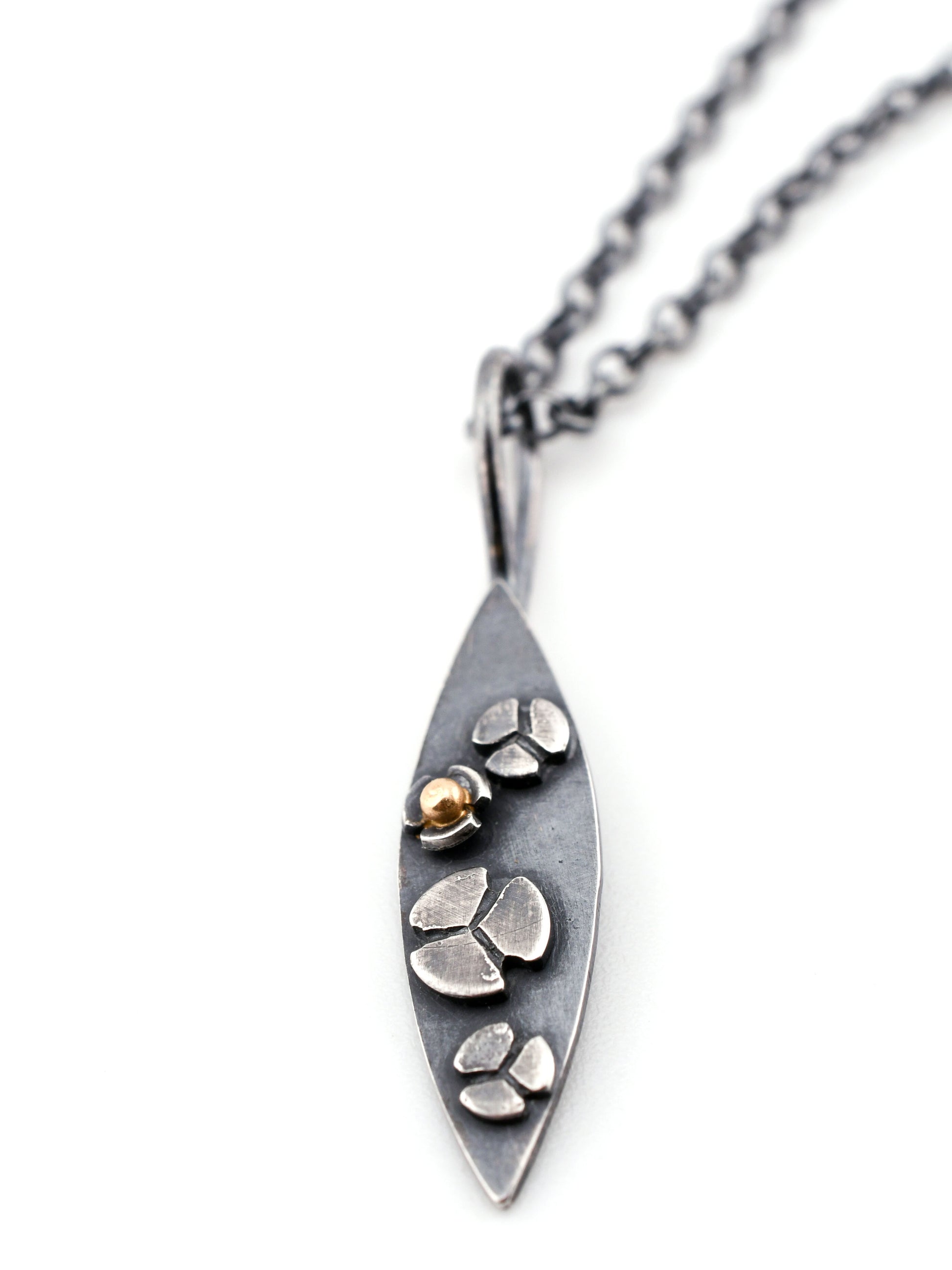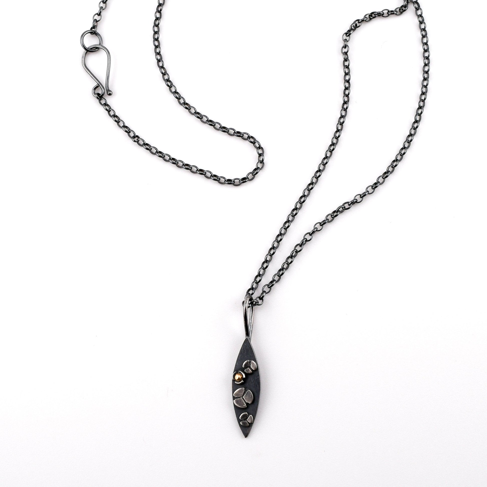 Stylized silver flowers drift gracefully across a slender marquise-shaped pendant in blackened silver. Each little flower is hand-carved from sterling silver and perfectly placed to make an elegant design. 14k gold glows from the centers of a few of the flowers for a touch of rich color. The necklace is oxidized and given a brushed finish to brighten the high points of the design, and contrast beautifully with the gold.